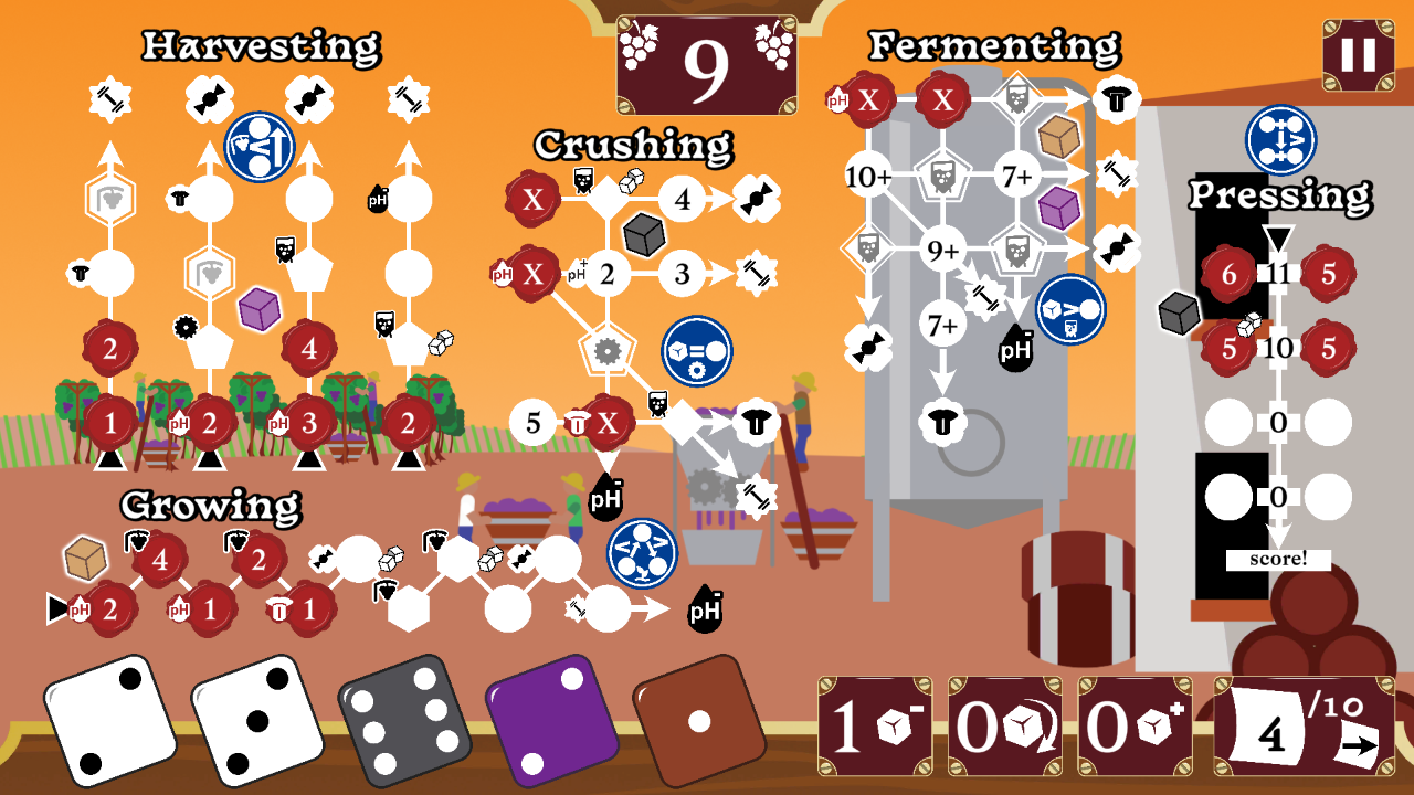 Be a vintner set on making the best wine they can in this digital roll-and-write board game. Aim for the highest score you can by balancing various processes in winemaking – from growing your grapes, to harvesting them, from crushing the grapes, to fermenting them, and finally pressing the wine to bottle – each process takes different dice and changes your wine in different ways.