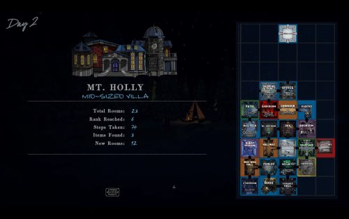 However, exploring a mysterious house and looking for secret hotspots is just not how this particular puzzle box operates. Mt. Holly is in a permanent state of flux. The floorplan for the day is constructed anew as individuals move through the house. Every time you go through a door, you are presented with three options for the room ahead which are selected at sort-of-random from the “draft pool”.