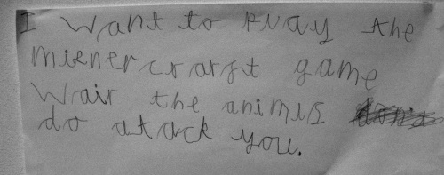 I set K up in creative mode but it only took a week before he made a demand to play survival mode. It was all my fault. I kept telling him my Minecraft stories of braving the depths and gathering resources, which sounded plenty more enticing than virtual Lego. Everything was awesome, just not awesome enough. “I want to play the Minecraft game where the animals do attack you,” announced the note tacked to the wall. He put it on the wall to make sure no one forgot, to ensure we took it seriously. No nonsense, please, parents.