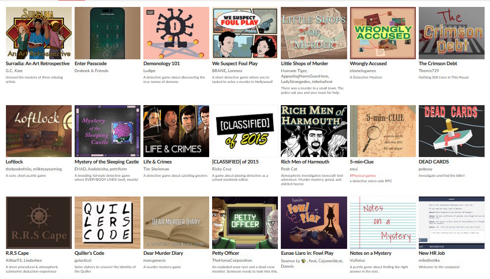 I’ll be looking at some of the thinky detective games made for December’s The Case of the Thinky Game Jam. All of the titles are free and can be downloaded from the jam’s itch page. I haven’t decided which games to look at yet, so I’d better get a move on, huh?